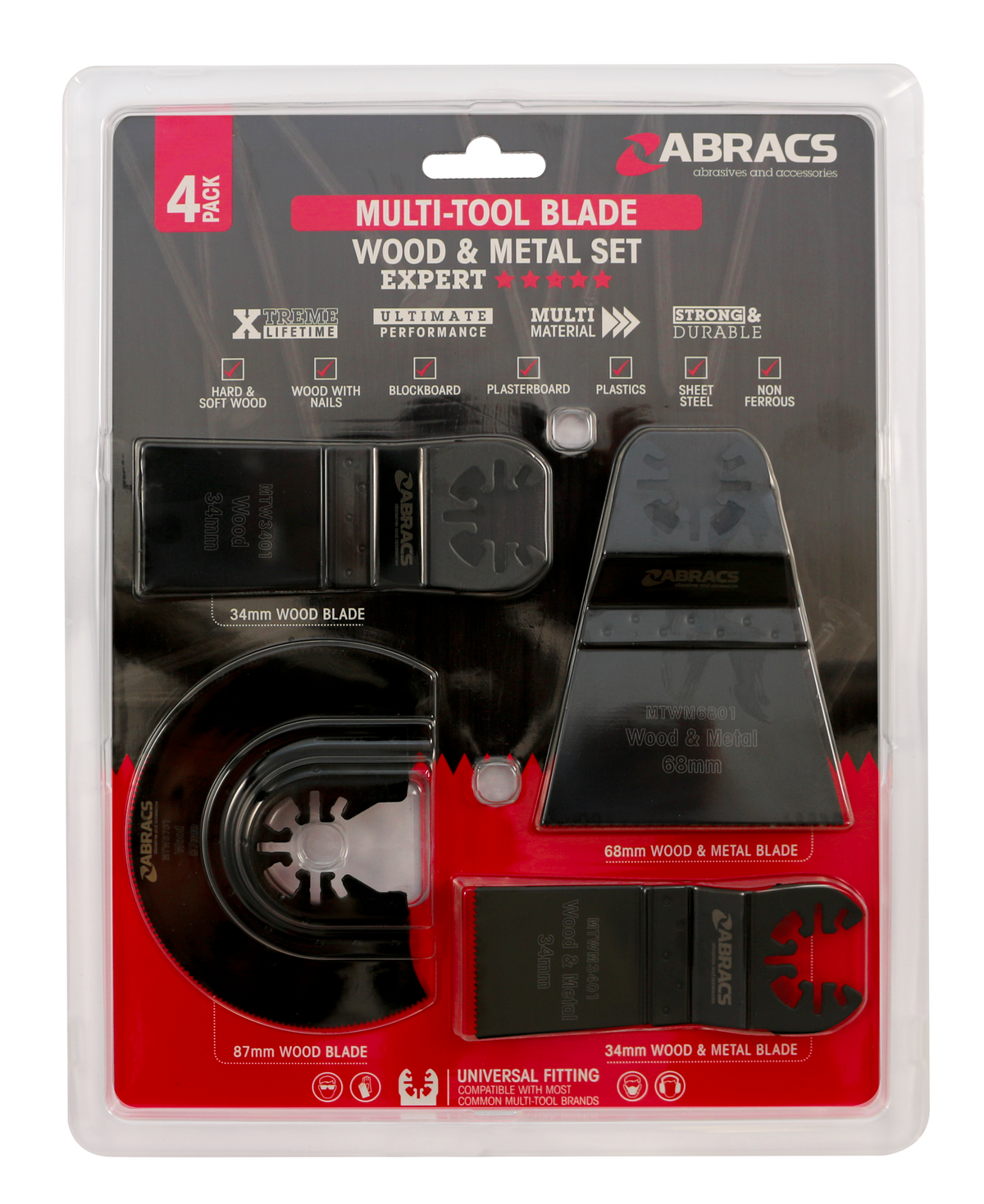 A. The specification notes a single mixed pack containing four wood and metal blades.