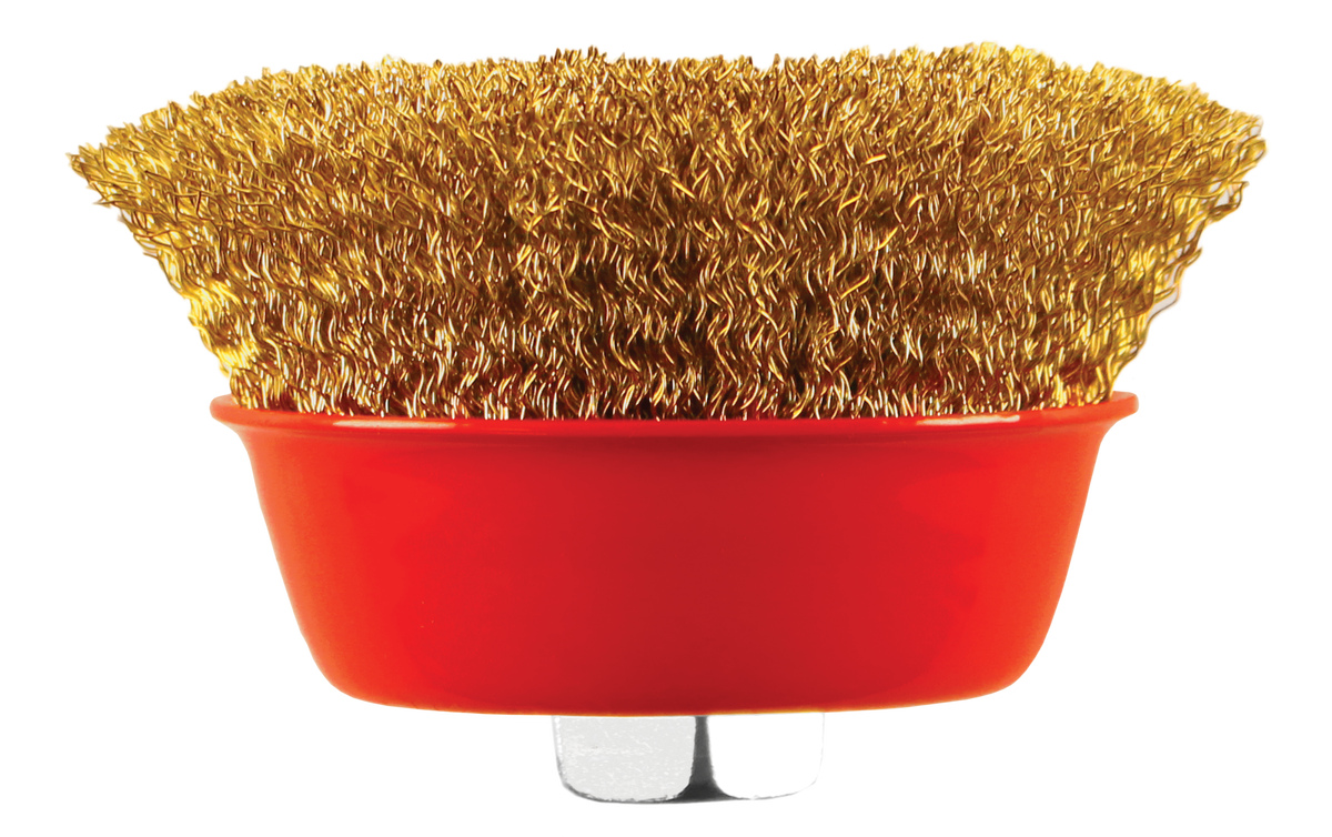 A. It is a crimped wire cup brush with an M14 thread, designed for use on compatible angle grinders.