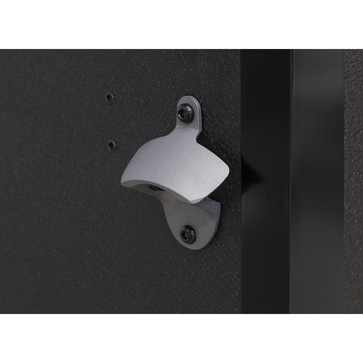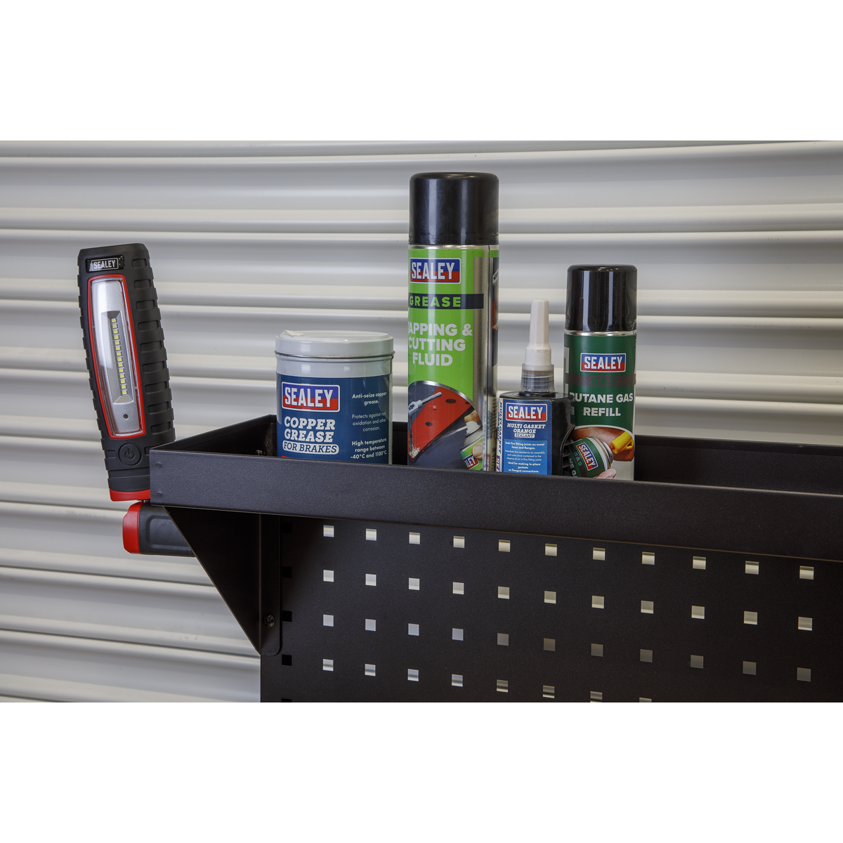 A. The pegboard is compatible with Sealey TTS hooks and includes a top shelf, enabling versatile hanging and small-item storage above the worktop.