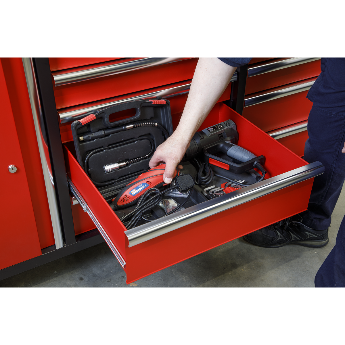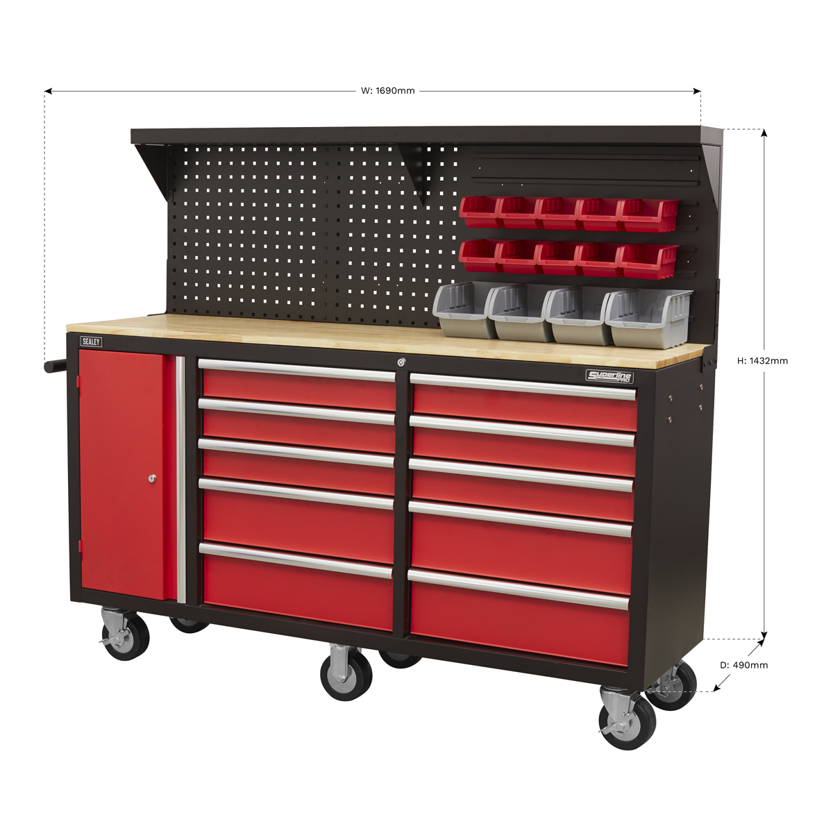 A. It has ten drawers, each with a forty kilogram capacity, featuring aluminium pull handles and non-slip liners for secure tool storage.