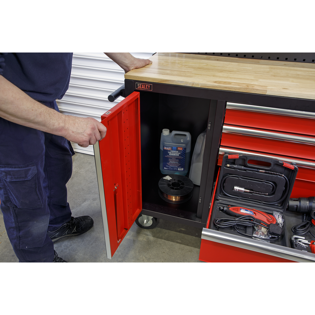 A. A lockable cabinet approximately 538mm wide, 480mm deep and 650mm high offers space for bulkier tools or equipment.