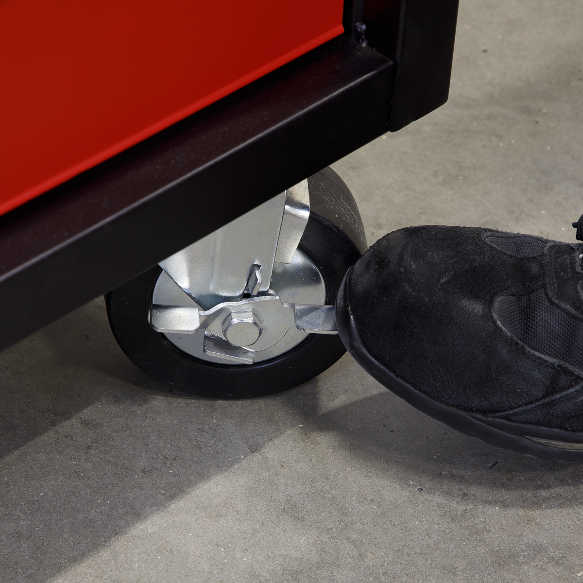 A. Six large castor wheels, four swivel and two fixed with brakes, plus a heavy-duty side handle make it easy to manoeuvre safely.