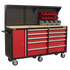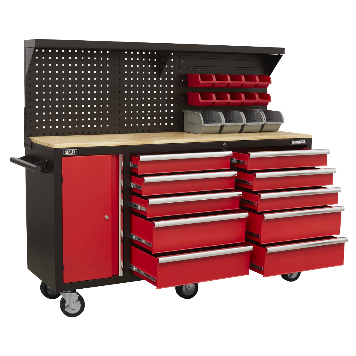 A. AP6310 offers a long wooden worktop, ten drawers, a cabinet, pegboard back and storage bins, forming a complete mobile workstation for tools and parts.